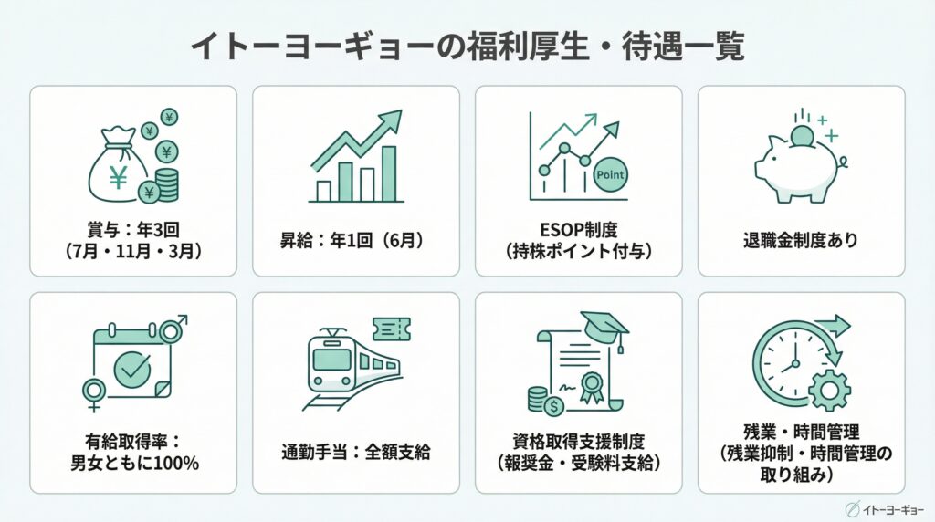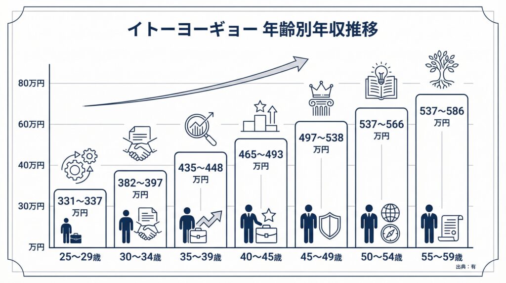 ※本記事のデータは有価証券報告書(2025年3月期)、公式採用ページ(イトーヨーギョー・doda・マイナビ)、企業分析NOTE、当サイト独自のアンケート調査をはじめとする複数の情報源に基づいています。年収データは推計・平均値を含むため、実際の給与とは異なる場合があります。最新の情報は企業公式ページまたは転職エージェントにご確認ください。